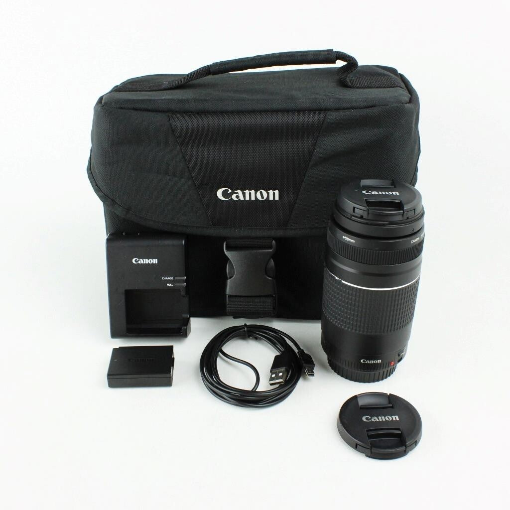 Includes 18-55 IS II lens, 75-300 III lens, Canon case, strap,