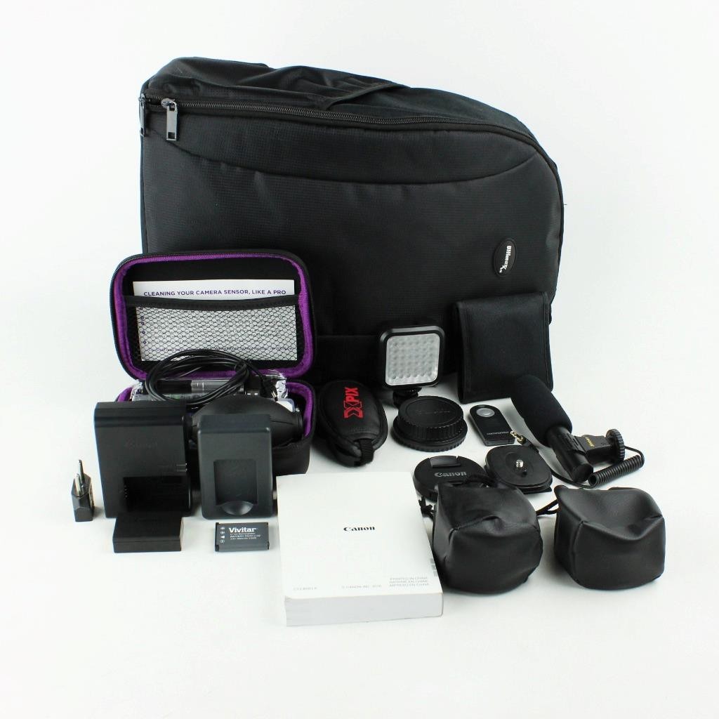 LED shoe light, cleaning kit, Canon charger, and battery.
