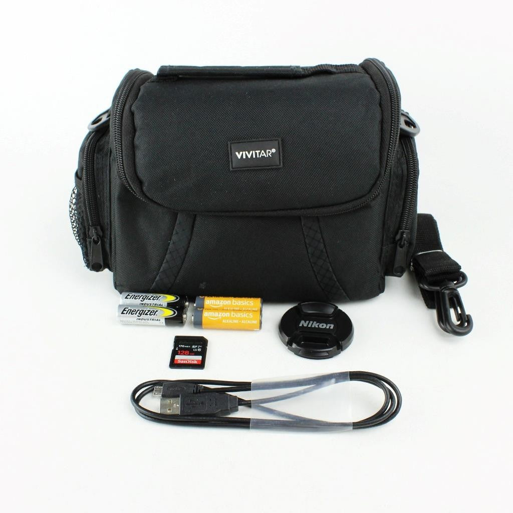 Includes camera bag, 128gb SD card, strap,